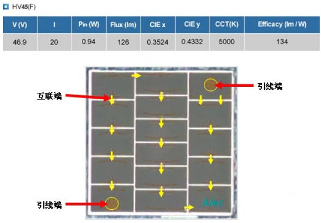 以HV45 为例,技术参数比较理想,VF=46.9V、IF=20mA、Pin=0.94W、Flux=126 lm、CIEx=0.3524、CIEy=0.4332、CCT=5000K、Efficacy=134 lm/W。HV45 是一颗在同一芯片上生成的LEDs 模组,芯片结构如图1 所示,图中可见有16 颗LED 的PN 结在同一芯片上串联,是芯片在生产时生成。片中黄色箭头是LED 的PN 结间的互联端,将16 颗LED 的PN 结串联,所以HV45 的VF=46.9V-DC 是16 颗LED 的PN 结的VF 值相加。左下端和右上端分别是整个LEDs 模组的二个引出线端。