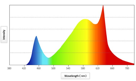 HV LEDs 光源可以是蓝色的、红色的或白色的,按实际需要设计生产。在LED 灯具设计时,可以考虑各种颜色HV LEDs 光源的搭配组合,以求需要的发光效果,LED 灯具设计师的自主空间和产品变换空间相当大。如将四个1W 的蓝光HV45 的HV LEDs 与二个0.7W 的红光HF25B 的HV LEDs 串联,即可设计成5.4W 的光源,VF=270V-DC,IF=20mA,发光效率 105 lm/W@5.4W、3000K,色温指数90。较采用传通的红色荧光粉提高30%的发光效率。高压、超高亮度紅光LEDs(HF25B) + 高压蓝光LEDs (HV45) 合成高显色、超高亮度暖白光(图2)。加入红光LED 后的高显色暖白光光谱如图3 所示。