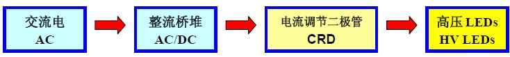 HV LEDs 应用技术相比于LV LED 的应用技术而言是十分的简单,HVLEDs 的典型应用方案:AC → 整流桥堆 → 电流调节二极管 → HV LEDs ,没有线路复杂、体积臃肿的驱动电源,没有短命的铝电解电容器,没有大的散热器。整个系统电路,只用了一个整流桥堆,一个电流调节二极管(CRD=CurrentRegulation diode),如图4 所示。
