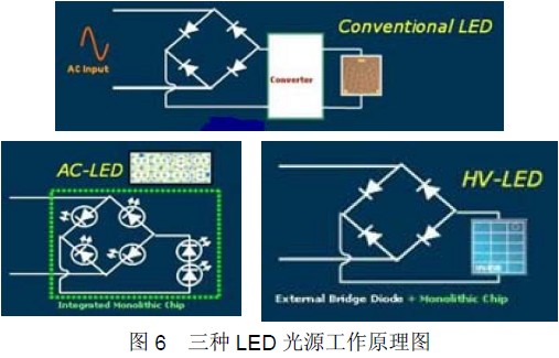 传统的 LV LED 用恒流源驱动发光的方案、AC LED 用AC LED 光源兼做整流和发光体的方案、HV LEDs 使用整流桥堆和CRD 稳流使高压LEDs 发光的方案,这三种LED 光源产品及其LED 照明灯具产品都将在近三五年内盛行,共争市场繁荣(图6)。世界社会将在分享它们的给人类带来的恩泽。HV LEDs 虽有如上优势,是否会在家用照明海量市场胜出,还需拭目以待。