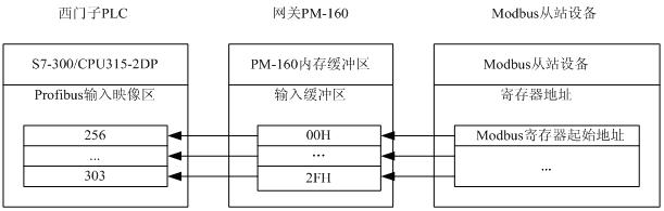 图15 PLC通过PM-160读写Modbus从站设备数据地址对应关系