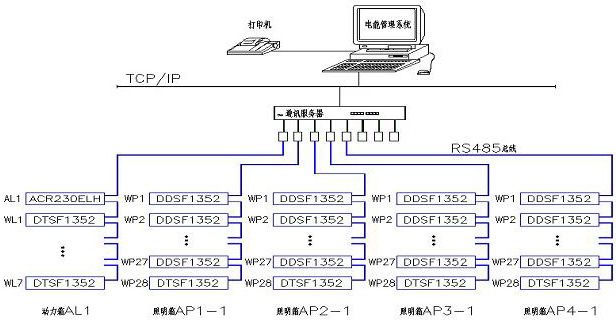 配电系统一次方案图列出了总配电箱及宿舍一层照明箱配电箱的支路数及各支路电能表的型号。为满足智能化监测及远程自动抄表需要,该电能管理系统采用RS485总线,将安装于总配电箱AL1总进线的1台ACR230ELH多功能电力仪表、安装于WL1~WL7及各楼层公共浴室的11台DTSF1352三相导轨式电度表及安装于宿舍楼各楼层的108台DDSF1352单相导轨式电度表(27×4层宿舍楼)进行集中组网,监控中心配置监控计算机、打印机、通讯服务器及必要的辅助设备,安装电能管理系统EMS软件完成对各台电能表的远程采集和数据的集中处理。电能管理系统图见图5。