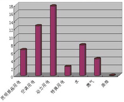 图5为图书馆能耗监测系统的主界面,可以查询各类能耗的使用状况,表1给出了图书馆能耗数据查询表,很清楚的显示出各类能源的使用情况。图6为系统给出的图书馆照明、空调及插座等用电量的饼图,很直观地显示出分项用电量的百分比。而图7是根据系统采集的所有分类能耗数据,由系统绘制出的分类能耗柱形图,可以形象的看出分类能源的使用情况。