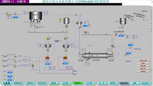 根据水泥生产的特点和实际I/O点的设计分布情况,进行以下设计方案,设计的基本功能包括:原料配料系统、生料磨系统、生料均化系统、烧成系统、窑头系统、煤磨系统、电力系统、报警系统以及趋势图等,系统按工艺流程分别介绍如下: