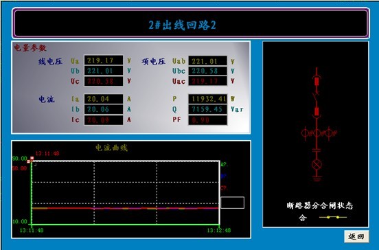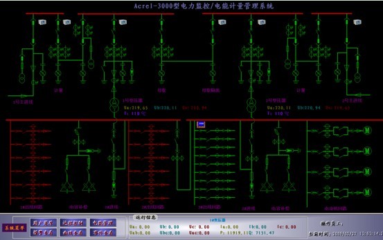 基于PROFIBUS-DP的电能管理与电力监控系统,上位机软件为ACREL-3000电力监控组态软件。通过该软件进行组态,可以在上位机界面上实现队所有电参量的实时显示,如I、U、P、Q、kWh等,图4所示为本系统的电能管理及电力监控系统主界面。
