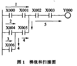 软PLC程序的遍历算法主要包括梯形图遍历算法和指令表遍历算法。梯形图程序由若干个梯级组成,遍历时以梯级为单位,采用深度优先的扫描方法。按从上到下,从左到右的顺序进行。在扫描过程中,遇到并联结点就转入下一行进行扫描,行与行之间的切换由指针的变换来实现,原先位置的指针被预先存储起来,待并联模块扫描完后。再从原来的位置开始往下扫描。梯级和扫描顺序如图1所示。