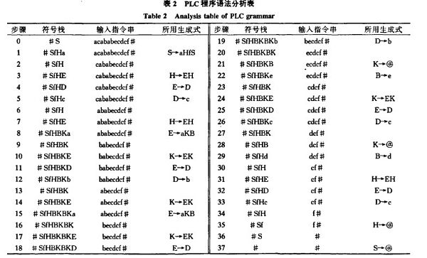 为了便于分析,用单个小写字母代替指令,即LD,LDI→a;AND,ANI→b;OR,ORI→c;ANB→d;ORB→e;0UT→f。指令表的文法可表示为1个四元式(Vt,VN,S,φ),其中,Vt是终结符号集,包括{a,b,e,d,e,f};VN是非终结符号集,包括{S,H,K,A,B,D,E};S是开始符号;φ中是产生式集(@代表空集)。因 此,指令表程序的文法G[S]为S→aHfS; S→AfS;S→@;H→EH;H→@;K→EK;K→@,A→DA;A→@;B→e;D→b;D→c;E→D;E→aKB。