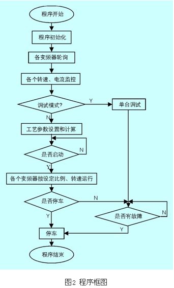 由于各个单元间是采用线性比例同步的,所以构建其数学模型非常简单,只要使某单元的转速和其相邻上一级单元遵循数学公式v1=k×v2即可。为了调节两单元之间的张力,只需调节两单元间比例k即可。这里需提醒注意的是:某一单元的转速必须以上一级为基础进行比例调节,这样才不至于在调节单元的速度时,影响其它单元间的张力。