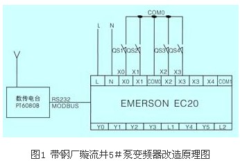 采用一台ec20-1006bra作简单的继电连锁,除了和旧系统进行连锁(互锁),还有变频器的简单启动和停止及报警。本系统还另外装有一台ec20-1006bra,通过串口与一台数传电台相通讯(modbus),来实现和另外一个水泵房(净环泵房)实现连锁。当璇流井有高液位报警时,通过plc及数传电台传送到净环泵房,由操作人员确定水泵的启动和停止(由于二者距离太远,且不适合电缆敷设,所以采用无线数传的方式)。