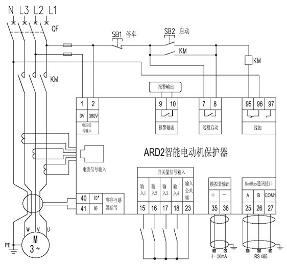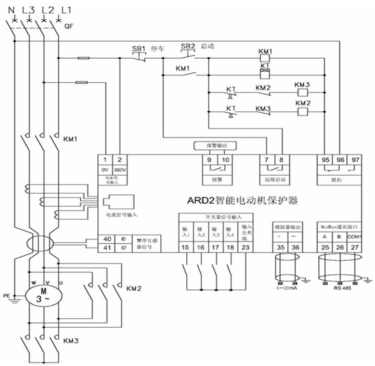 图9为采用直接启动接线方式的ARD2智能电动机保护器典型应用图。用户可通过按动外部启动按钮SB2或通过上位机远程控制保护器的启动继电器来启动电机。其控制方式为:当启动按钮SB2按下或远程启动继电器7、8闭合,则接触器KM的吸引线圈处于通电状态,使接触器KM的主触头和自锁触头KM闭合,启动电动机。此时,松开SB2或启动继电器7、8断开后接触器KM的吸引线圈还是处于通电状态,主触头和自锁触头KM仍旧处于闭合状态,电动机处于通电状态。一旦电动机正常启动后,保护器就对电动机的运行状态进行监测,当电动机出现故障状态后,ARD2保护器的脱扣继电器动作,常闭触点95、96断开,使接触器KM的吸引线圈断电,使接触器KM的主触头和自锁触头的状态由合变为分,切断电动机的供电,使电动机停车。