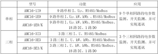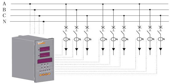 图6为AMC系列单相多回路智能监控单元的典型应用图。在应用中,出线回路中的9个单相负载的所有电参量测量都由1个AMC单相多回路监控单元来实现。并带有Modbus通讯输出,供用户远程监测和控制。