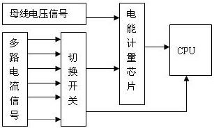 多路电流信号经电子开关进入电能芯片,结合母线电压即可由电能芯片测得多个回路的各种电参量。
