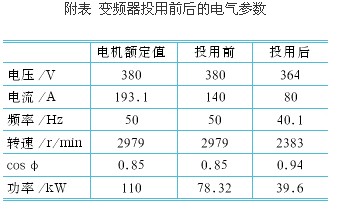 变频调速器投用后,控制回路的稳定性和可靠性比调节阀有明显提高,控制偏差保持在±1%以内,被控参数波动幅值较小。电机在变频调速器的控制下保持中速运行状态。在电机启动、控制过程中实行延时斜升、斜降,并且有输出短路、欠压、过流、过载过热等报警跳闸及在线故障诊断功能,保证其运行安全可靠,降低故障率,减少了设备损耗,尤其显著的是节能效果相当明显。在正常工况下,投用前后的电气参数如附表所示。