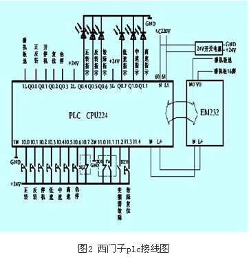 plc控制系统采用德国西门子plc,模块化结构,配置包含有数字输入、输出模块、模拟量输入输出模块、电源模块、cpu模块等。在本系统中采用西门子cpu224和模拟量模块em232。cpu224有14个(i/o)输入接口和10个输出接口。模块em232控制变频器的运行频率,进而控制电机的转速。