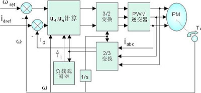 因此一般的线性控制方法效果不够理想。为了解决其控制问题,当前采用的非线性控制方法主要有变结构控制、反馈线性化和无源控制等,但这些非线性控制的设计方法比较复杂,不易理解。本文结合矢量控制的坐标变换方法,提出了backstepping控制策略,它不但能够实现永磁同步电动机系统的完全解耦,设计方法比较简单,而且控制效果比传统的pid控制更具有明显的优越性。另外,通过设计负载转矩扰动观测器[6]来降低负载扰动对速度波动的影响。
