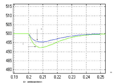 仿真如图3所示。对图3中的圆局部放大,如图4所示。图4中的曲线1为反推控制下的速度跟踪曲线,曲线2为引入转矩扰动估计的反推速度跟踪曲线。由仿真结果可以看出,反推控制能够使的系统达到快速的速度跟踪,同时保证系统具有良好的动态性能。同时,引入转矩扰动估计的反推控制更能加快了系统的跟踪速度,减小扰动对速度波动的影响。