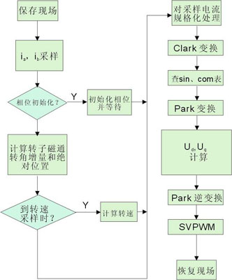 为了实现基于负载扰动估计的反推控制方法,特选用电机控制专用dsp芯片tms320lf2810作为数字控制器,并编制相应的软件来实现。如图5所示,图6为定时中断子程序来实现反推控制策略并产生svpwm。本文把基于转矩扰动估计的反推控制应用于永磁同步电动机的速度跟踪中,该设计方法减少了调节参数,简化了系统的控制设计。通过matlab仿真,表明系统有很好的跟踪性能,验证了系统设计的有效性和可行性。另外,此控制策略已应用于浙江省计划重点项目:“全数字交流通用伺服驱动系统”中,它表明,调节参数比pid相对减少,参数整定比较容易,减轻了编程工作,系统取得了良好的效果。