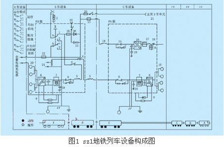 如图1所示,sz1地铁列车为6辆编组(4m2t)的两个3车单元(2m1t)对称设计。每个3车单元都由一个带司机室的拖车a和两个动车(带受电弓的动车b和不带受电弓的动车c)组成。两个3车单元用半自动车钩连接。