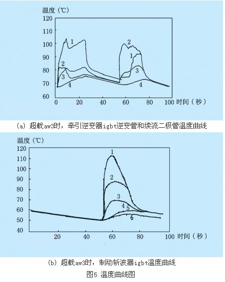 图5(b)为超载(aw3)时,制动斩波器igbt温度曲线。此时,制动斩波器igbt的最高结温112℃(100%电阻制动);igbt的最高结温87℃(50%电阻制动),环境温度40℃。