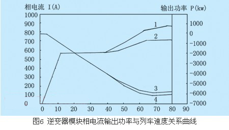 图6为制动时,牵引逆变器模块相电流、输出功率与列车速度关系曲线。从曲线中可以看出,在dc1500v/80~60km/h时,再生制动电流超过800a,输出反馈功率约5800kw;在dc1800v/80~65km/h时,再生制动电流约700a,输出反馈功率约6000kw。
