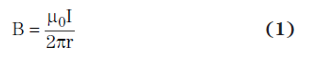 其中,B为以第平方米伏秒 (V•s/m2) 表示的磁通密度,μ0为自由空间中的磁导率(计算方法为4π×10–7 V•s/A•m),I为以安培为单位的电流,r为以米为单位的导体距离,而H为以安培每米 (A/m) 为单位的磁场强度。