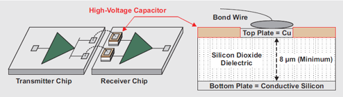所有隔离器都有一定形状或者形式的导电环路,以让磁场线穿过并产生EMF。如果强度足够大,则这种叠加到信号电压上的EMF就会导致错误数据传输。实际上,一些隔离技术对电磁干扰非常敏感。为了理解电容隔离器为什么不受磁场的影响,我们需要对其内部结构进行研究。