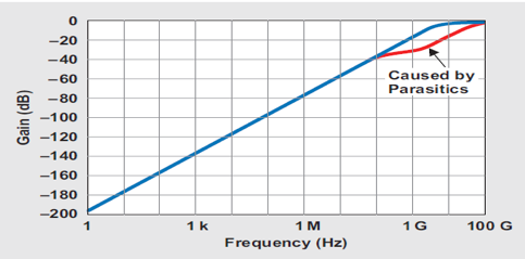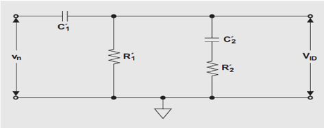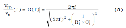 一次电路仿真证实了RC网络为一个一阶高通滤波器,其C′1和R′1为主要组件,频率高达100 MHz(参见图5中蓝色曲线)。超出这一频率以后,寄生组件C′2和R′2生效,从而引起稍稍偏离于线性的斜率。因此,频率达到100 MHz 以后,增益响应可以表示为VID/vn的比: