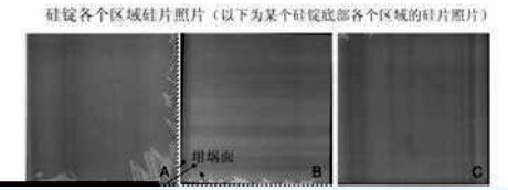 准单晶产品单个晶粒面积可达整张硅片的90%以上,位错密度比较低,部分硅片约95%及以上区域几乎无位错,边缘存在""带状""分布高位错区域,部分硅片中含亚晶现象。以昱辉virtuswafer产品为例:靠近坩埚面的区域为多晶,其他区域根据长晶体情况,若长晶体情况较好的话基本为单晶,如图1C所示。
