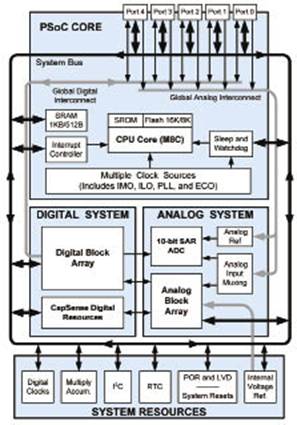 PSoC可编程片上系统系列产品包含许多器件。 这些器件旨在使用一个低成本的单芯片可编程组件取代多个基于MCU的传统系统组件。 PSoC器件包含多个可配置的模拟和数字逻辑模块,以及可编程互连。这种架构使得用户能够根据每个应用的要求,来创建定制的外设配置。此外,在一系列方便易用的引脚布局和封装中还包含快速 CPU、闪速程序存储器、SRAM 数据存储器和可配置的 I/O。
