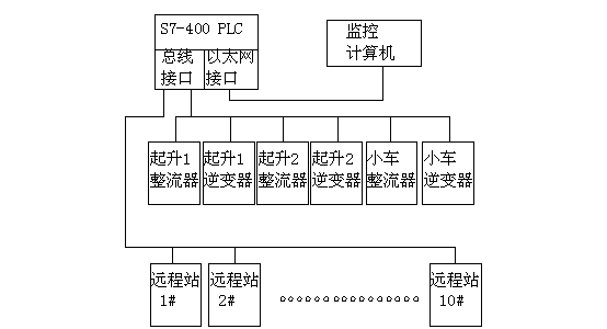 图1-1中,S7-400 PLC是整个系统的核心所在,它有两个PROFIBUS总线接口,一条总线连接所有传动机构变频器(变频器由整流器与逆变器组成),这样一来变频器所需要的命令,运行状态的反馈等信号均可以通过PROFIBUS通讯来实现。另一条总线则连接所有的I/O远程站,实现采集信号和输出信号,大大节约了布线。PLC同时也带有以太网接口,可以方便的与计算机连接,这样一来工程技术人员可以通过计算机的人机界面来监控岸桥的运行,同时该计算机也可以作为编程器,用来配置PLC硬件,修改PLC程序。
