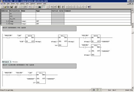步骤三:编写“起升速度的控制”程序。在这段程序中:当司机在驾驶室把控制电源合上,并发出起升命令,如果有减速命令存在,则将给定值变为原来的10%,程序如下图2-4所示。