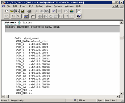 步骤四:编写“起升命令与速度控制”程序。以上的程序完成了岸桥起升运行的命令和速度给定的产生,最终我们就是要将这命令与速度给定通过PROFIBUS总线传输给变频器,如图2-6是调用了西门子公司功能块库中的一个PROFIBUS数据传送功能块PCD_SEND,用来传送数据块DB123中的16个字。。