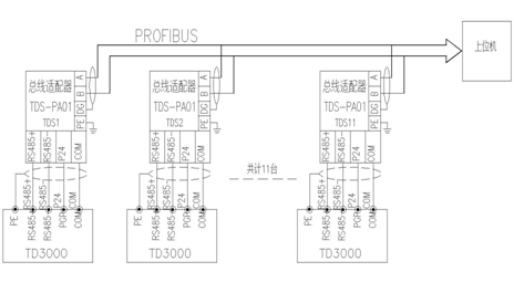整套工艺流程采用顺序起动操作顺序,上位机采用PROFIBUS-DP总线控制变频器,SM-PROFIBUS-DP总线与总线适配器TDS-PA01通讯控制变频器,精准控制电机的转速。PROFIBUS-DP总线通过对TD3000变频器“状态字”读取,来调整“控制字”的发送,使其装料滚道、出料滚道同步有序运行,如图3所示。