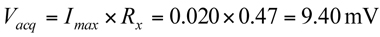 为了实现电流测量,电流需要流经一个阻值非常小的电阻,然后必须对这个电阻上的电压进行测量。在电流测量期间,需将电流测量设备串接到电路。因此可以预见的是,设备内部阻抗不会影响到电路,或者至少这个阻抗的影响是很小的。本例中的电流电压转换使用的阻值是Rx = 0.47Ω。作为使用低值电阻的结果,在最大电流值时获得的电压值(Vacq)也是非常小的(参见公式2)。