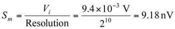 最终结果是,在电流测量实现过程中达到的分辨率为10位,同时我们可以计算出测量精度(Sm),见公式4。