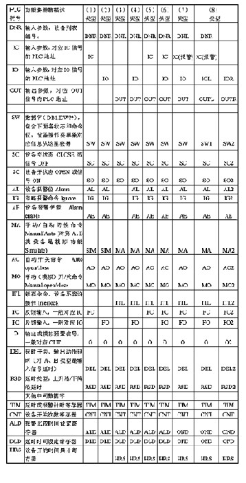 如果用西门子step7来编程,可以用一个数据块db来储存所有数字量设备的状态位和命令位,每个设备占用一个数据字dw,根据设备的顺序编号,可以访问该设备在数据块中的数据字。下面列出各种模块的输入输出参数和各个状态位、命令位的符号。见附表。