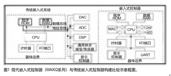 如今,一类新的嵌入式控制器已经出现,它们能在同一硅片上整合高性能数据采集子系统,具有近似DSP功能及RSIC-CPU核,从而简化了外部模拟接口。图1示意了现代嵌入式控制器(MAXQ系列)的整合能力,并与传统微控制器作了比较。