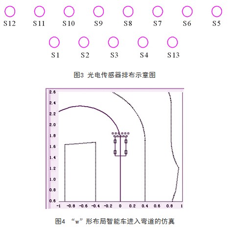 经多次仿真实验,最终确定了传感器的布局和数量。采用如图3所示的“w”形布局,一共有13个传感器,前排8个,后排5个,前后两排间距为3.5cm。设置这个间距,使其对赛道有一定预测功能。具体的布局及仿真效果如图4所示。