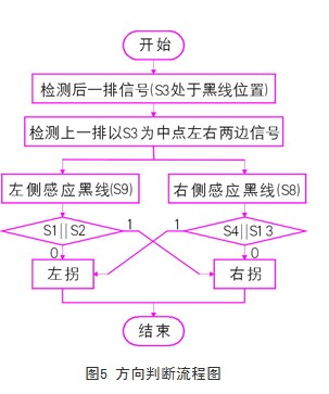 但同时还应注意,当车模进入左侧弯道时,也可能出现s3和s8共同检测到黑线的情况,这种情况下就要检查上一时刻的传感器信号,就是检测s4||s13的情况,若s4||s13结果为1,则认为车模应左拐,若s4||s13结果为0则应右拐。一次方向判断的流程如图5所示。
