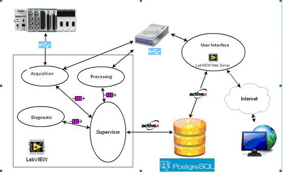 多个模块组成应用程序, 监督模块读取数据库设定,并根据这些设定、命令在预定时间执行各种采集、后续处理与可用数据的诊断。 用户界面模块提供已采集信号的存取,以及用诊断结果进行简单的分析功能,例如1个或多个采集的快速傅里叶(FFT)显示,而且该模块可互相比较。 无需下载已采集的信号,任何用户都可以通过网络浏览器连接至该界面。