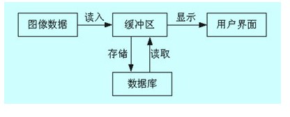 图像数据的访问分存储和读取两个过程。在存储过程中,由于存放图像数据的字段是可变长度(长度一般为0~2g)的blob类型,无法直接存储,必须首先将存储在文件中的图像数据以二进制流的形式读到缓冲区中,然后再将缓冲区中的图像数据添加到access数据库中的ole对象中。在读取过程中,将存放在access数据库中的图像数据读到缓冲区中,然后在显示在用户界面上。图像数据的访问原理如图1所示。