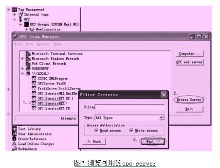 打开wincc项目后,在tag management变量管理器中加载opc.chn协议。右键点击协议的system parameter后可在窗口中浏览到opc.simaticnet。选中opc.simaticnet并点击browser server按钮,即可进入opc变量管理器中。图7为浏览可用的opc server。
