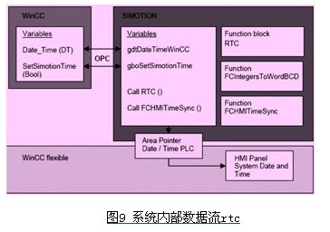 wincc与simotion d445之间的时间同步功能无法简单的通过wincc自带的时间同步选件来实现。因此simotion需要从wincc中获取系统时间,再将时间设置进面板中以实现三方的时间同步。具体为simotion项目中包含了两个st(structured text)单元,其中“timesync“单元包含了名为“timesync“的被周期性调用的程序,用来从wincc中读取系统时间到simotion的同时,再将系统时间写进simotion的区域指针中,以此实现与wincc flexible的时间同步。而名为“hmitimesync“的单元包含两个功能块用来在程序中生成区域指针。其内部的数据传递和接口由图9给出: