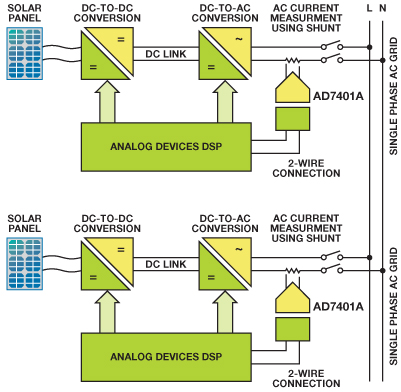 因此,智能电网整合的一项重要局部特性可能是储能,即通过将不需要的电能储存起来供高峰时段使用,从而减少电网中的湍流。本文余下部分将重点讨论电气隔离在保护仪器仪表电路(用于测量和控制来源、互连和储能元件)上的作用,并首要强调iCoupler技术的重要作用。具体而言,AD7401A隔离式ADC和ADuM4223隔离式栅极驱动器可提供满足新型太阳能PV逆变器设计要求的性能。