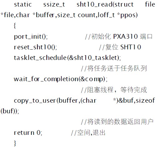 驱动程序初始化完成后,上层应用程序可以调用sht10_fops 中的sht10_read 函数进行温湿度的读取操作。