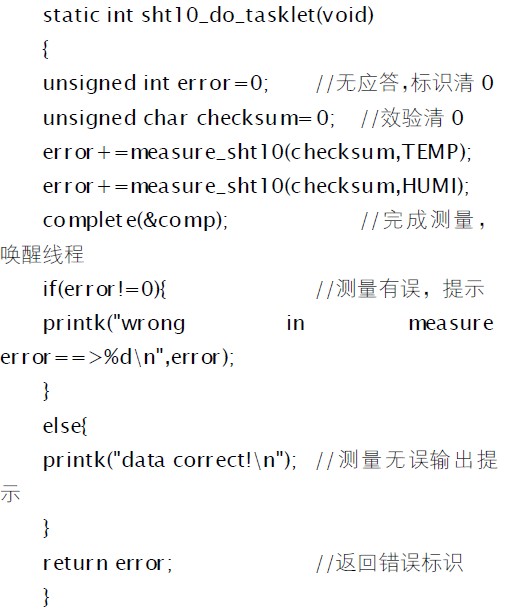 Tasklet 始终在中断期间运行,并且在调度他的同一CPU 上运行。对比单片机系统,在单线程情况下,一般在sht10_read()中调用2 次measure_ sht10()来等待测量完成,测量效率依赖2 次测量消耗的时间;但在Linux 驱动程序中,使用Tasklet 方式操作,2 次测量过程不会对其他线程产生影响,在有其他实时事件需要及时处理时(如网络,视频),可以更有效提高驱动运行效率,降低对其他实时处理产生的影响。
