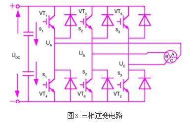 逆变部分(dc-ac)采用采用的功率器件集驱动电路,保护电路和功率开关于一体的智能功率模块(ipm),主要拓扑结构是采用了三相逆变电路原理图见图3,利用了脉宽调制技术即pwm(pulse width modulation)通过改变功率晶体管交替导通的时间来改变逆变器输出波形的频率,改变每半周期内晶体管的通断时间比,也就是说通过改变脉冲宽度来改变逆变器输出电压副值的大小以达到调节功率的目的。