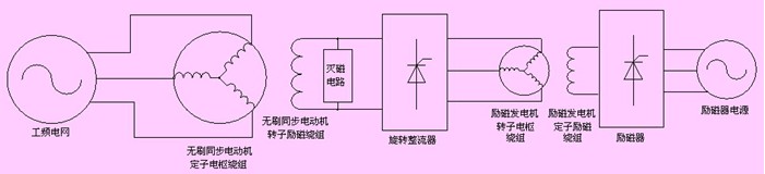 无刷同步电动机在工频稳态运行时,励磁器向励磁发电机的定子励磁绕组通以适当的励磁电流,在励磁发电机的转子电枢绕组端部感应出三相交流电压,由旋转整流器(等效于二极管整流器)整流成直流电压,施加在无刷同步电动机的转子励磁绕组上,为其提供持续的励磁电流。