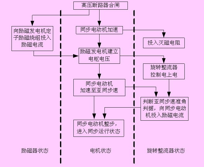 高压断路器合闸后,励磁器触发晶闸管,向励磁发电机的定子励磁绕组通以一定的励磁电流。随着电机转速的升高,励磁发电机的转子电枢绕组电压逐渐升高,当其高于旋转整流器的最低工作电压后,由其供电的旋转整流器控制器上电,旋转整流器监测同步电动机励磁绕组上的感应电压,当其周期大于预设值(表示同步电动机已到达亚同步速)且到达反向过零点时,触发整流晶闸管,关断灭磁晶闸管,将励磁发电机的转子电枢电压整流后加在同步电动机的励磁绕组上,完成投励。