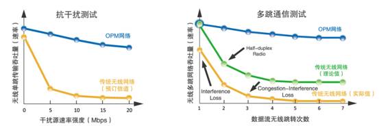 OPM技术是基于机会认知机制的智能无线网络(Opportunistic Mesh),OPM网络的每个节点自动机会地使用网络资源:包括无线频谱资源和无线站。网络节点在传输每一个数据包的同时亦在检测下一个数据包传输可以使用的最佳路径和无线频带。如果当下的物理信道被干扰,网络节点会在毫秒级的时间切换的另一个可用信道。这样网络资源的利用可以达到其瞬间最大值。通过建立新的跨层协议栈设计,在技术上OPM对传统无线网络的改造,从而大大地提高了网络扩展性和抗干扰性。网络带宽在经过多个节点后(多跳)保持稳定。在下面的量化图表中可以看到OPM网络这两方面的明显优势。